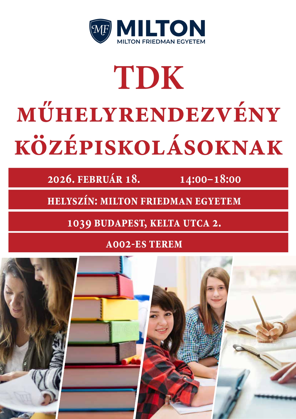 A Tudományos Diákköri (TDK) Műhelyünk a Milton Friedman Egyetem hallgatóinak tudományos csoportja, közössége. Az Intézmény TDK csoportjának célja, hogy a különböző területek, – legyen az társadalomtudományi vagy pedagógia, gazdasági -felé orientálódó hallgatóink, oktatóink és szakembereink segítségével tudományos tevékenységekben kipróbálhassák magukat, illetve kutatást, publikálást folytathassanak.